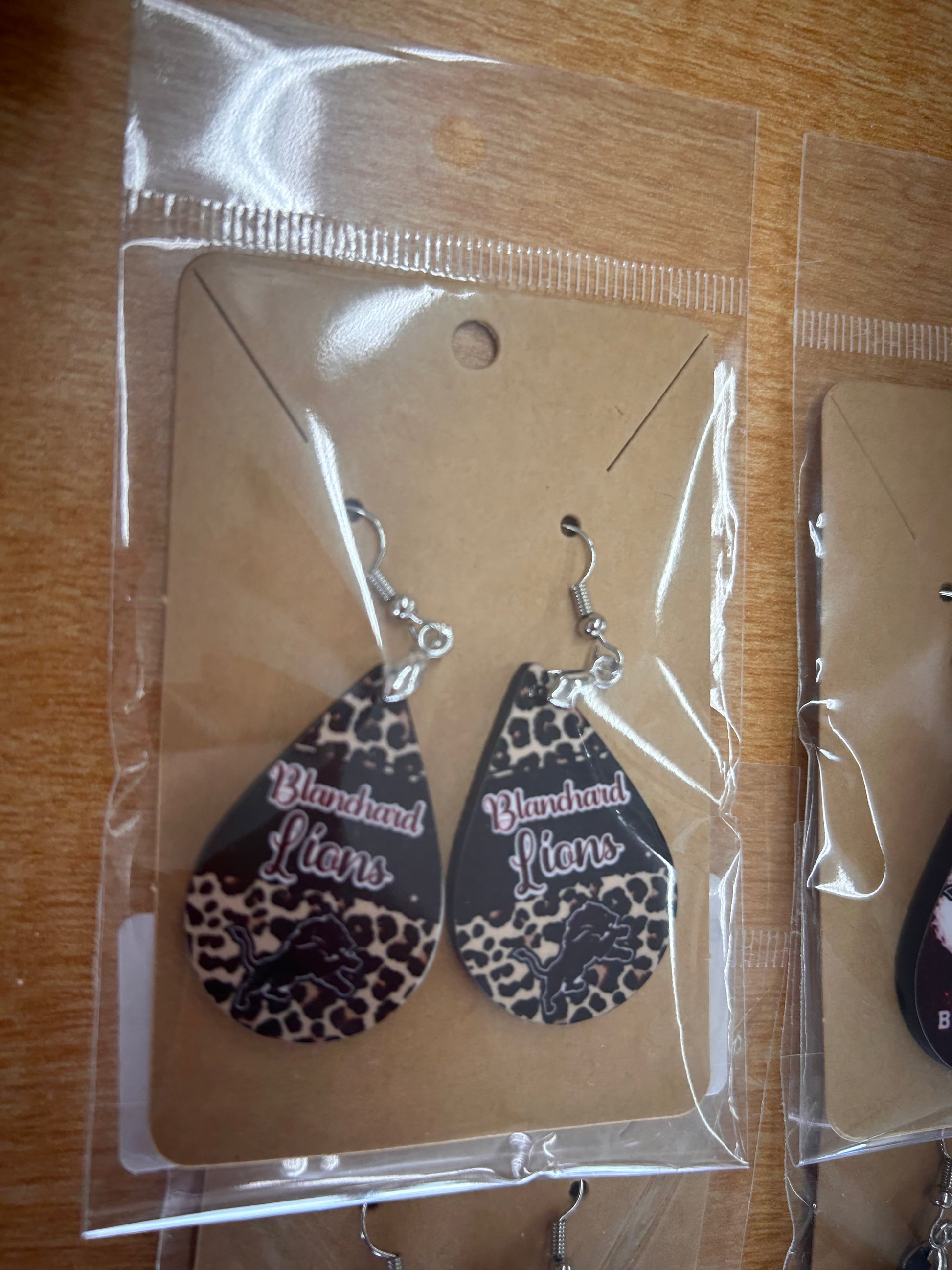 These earrings are dangle earrings with Blanchard lions on it. Perfect for our small-town games. Or show your support of Blanchard Lions wearing these out running errands. We love how these earrings are handmade by our vendor in store Wildthings 67 LLC. They dangle so cute when worn!