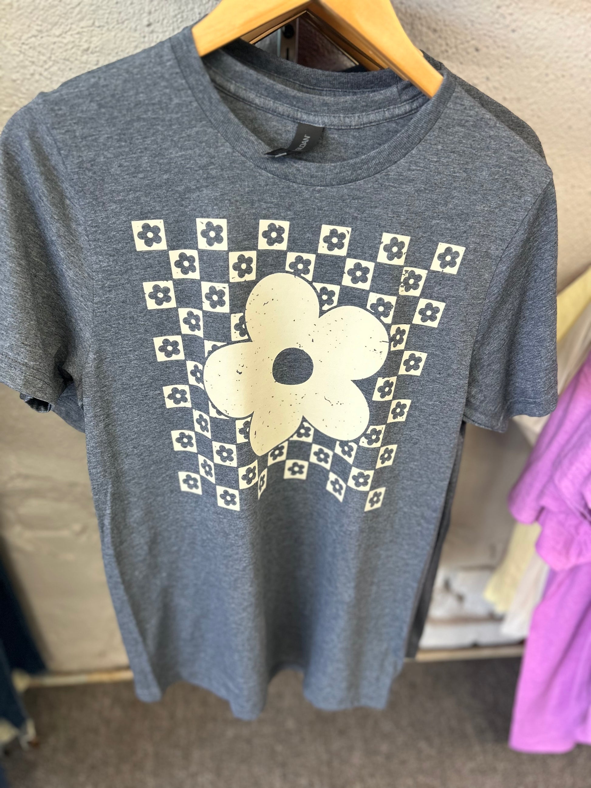 - ” Grey colored tee with white screen print “Beige color flowers graphic design”